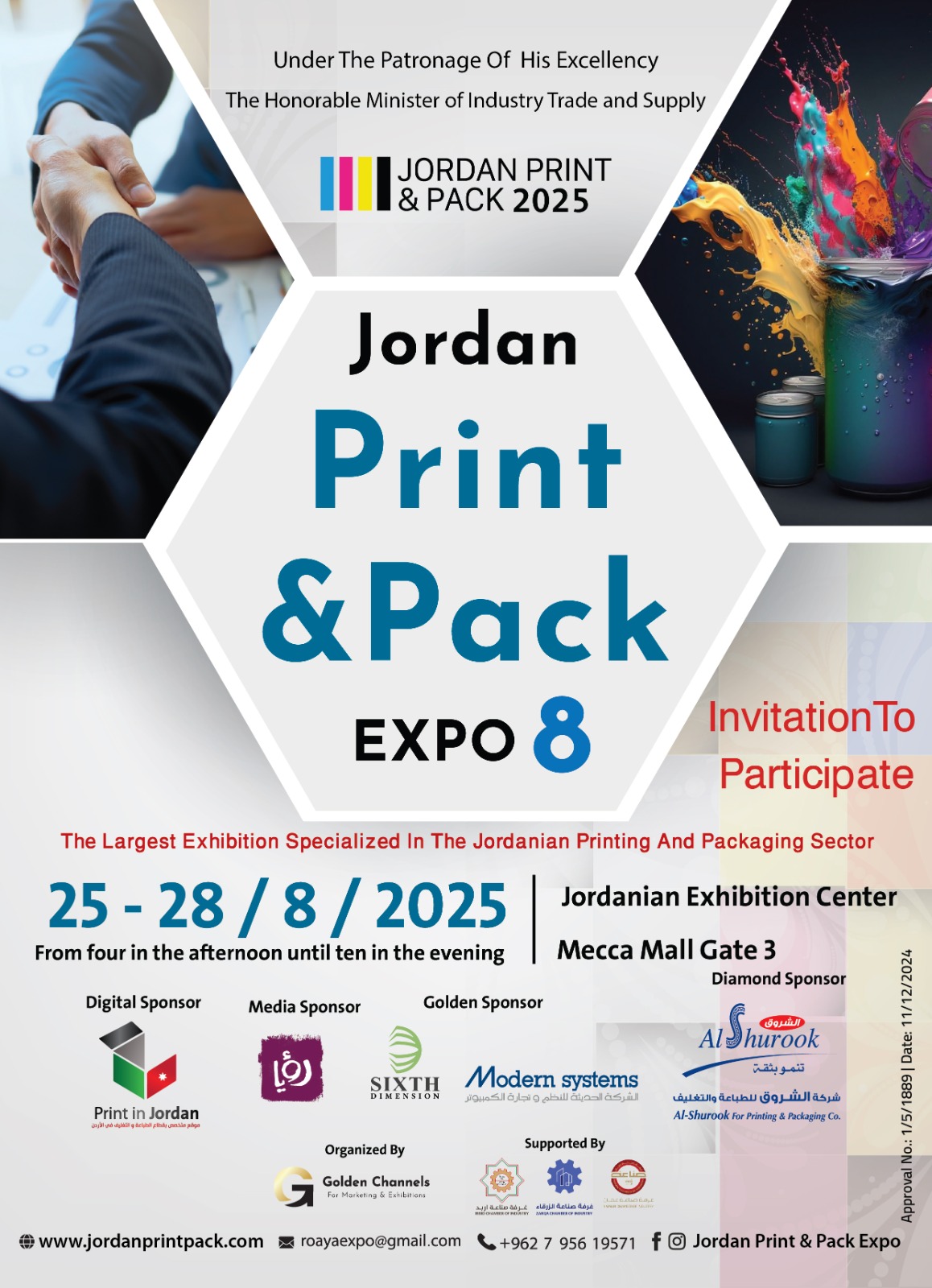 Under the Patronage of His Excellency the Minister of Industry, Trade, and Supply, we are holding the eighth edition of the Jordan International Printing, Packaging, and Printing Exhibition, the largest exhibition for the printing and packaging sector in Jordan.